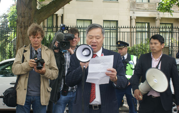 经过大约25分钟的游行,华人示威队伍来到日本驻荷大使馆门前,口号声此起彼伏。荷兰中国和平统一促进会会长胡允革宣读了抗议书,接着,华人和留学生代表向日本使馆递交了抗议书。
