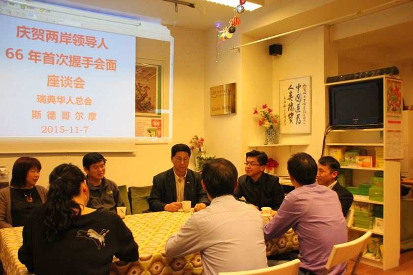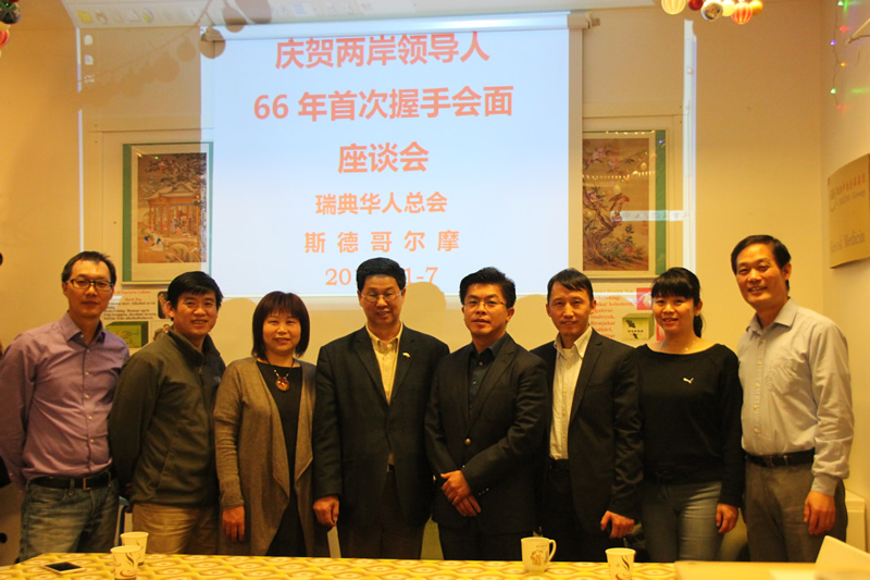 7日,瑞典华人总会、瑞典中国和平统一促进会为庆祝两岸领导人66年来第一次握手,开创两岸历史的新局面,当天,晚上8点即刻召开座谈会,畅谈世界华人非常关注的两岸和平发展大事。座谈会上,播放了习近平和马英九握手时刻和会谈的电视转播。然后,参加座谈会的代表纷纷发言。大家相信习近平马英九通过这次在新加坡握手、会谈,双方在“九二”共识的基础上,会给中华民族带来福祉。