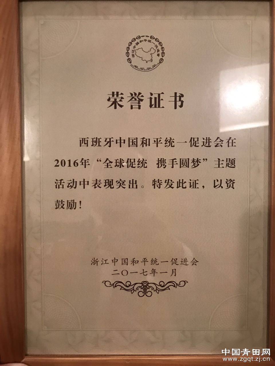 西班牙统促会喜得浙江省委统战部表彰