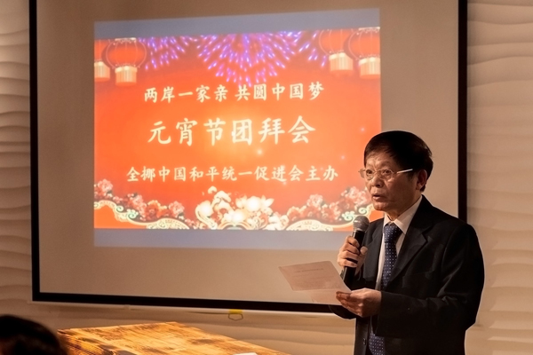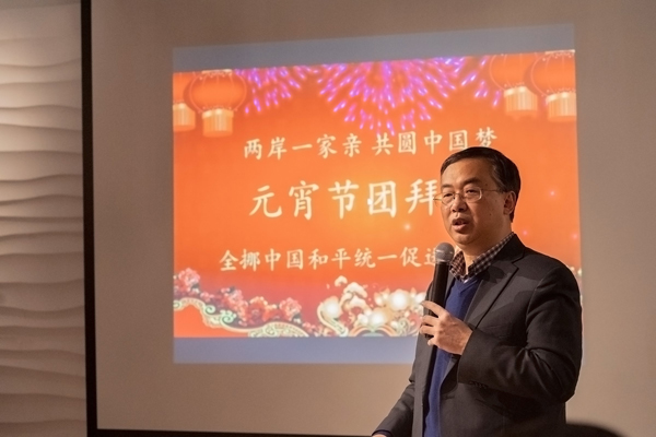 2月17日,全挪中国和平统一促进会在挪威首都奥斯陆丽华饭店举办了主题为“两岸一家亲,共圆中国梦”的元宵节团拜会,并学习了习近平总书记在《告台湾同胞书》发表40周年纪念会上的重要讲话精神。参加会议的华人华侨和各社团侨领有六十多人。中国驻挪威大使馆王民大使、董凤鸣参赞和孙怀宇主任出席了会议。团拜会由马列和金萌主持。