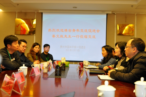 12月13日,澳台青年交流协进会蔡文政会长率团一行19人拜访贵州中国和平统一促进会,并开展座谈交流活动。双方就推进“两岸四地”青年交流交往、增进“四个认同”进行了交流,并达成继续携手发挥各自优势促进黔澳交流合作意向。