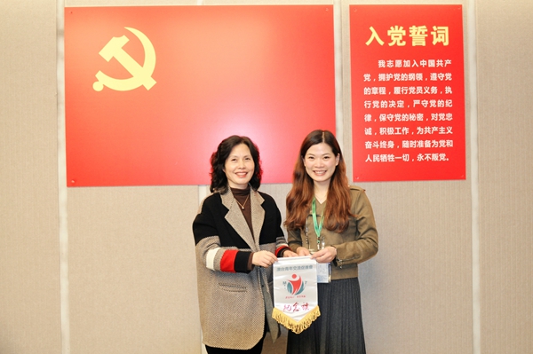 澳台青年交流协进会参访团团长林秀霞(右)向贵州统促会赠送纪念旗