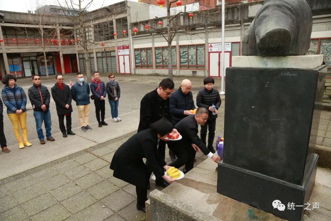 加拿大中国(友好)和平统一促进会荣誉会长刘朝方、加拿大和平与发展交流协会荣誉会长胡培峰和刘书梅、吴家明、庞天明、姬泙等大温侨界人士出席了此次活动,并怀着无限崇敬的心情面向孙中山先生铜像三鞠躬。