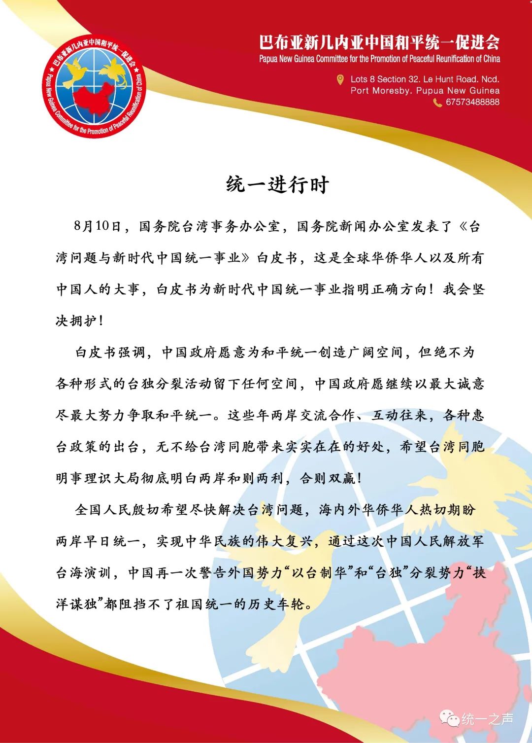 如今,《台湾问题与新时代中国统一事业》白皮书的发表是非常重要和非常及时!海外华侨华人和爱囯侨团,坚决支持和坚决拥护!任何企图分裂祖国的阴谋诡计注定要失败的!我们坚信,在伟大的中国共产党坚强领导下,一定会解决台湾问题,早日完成祖国统一大业!