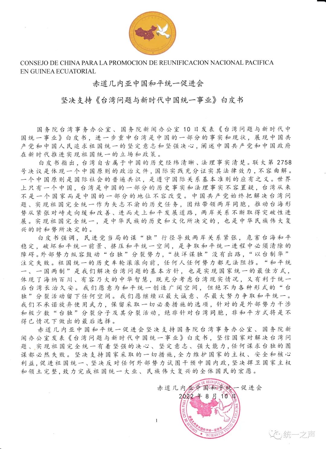国务院台湾事务办公室、国务院新闻办公室10日发表《台湾问题与新时代中国统一事业》白皮书,再次全面阐述新时代下中国共产党和中央政府引领中国人民推进和实现祖国统一的立场和政策,具有重要的战略意义和现实指导意义。我们旅居海外的侨胞深受鼓舞,坚定支持白皮书的所有具体主张,坚决发扬其内涵精神。