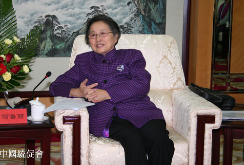 何鲁丽在座谈中向访问团介绍大陆改革开放三十年的发展。谈到两岸关系时,她表示,十一月初海协会与海基会首次在台北举行正式商谈,标志着两会从此进入制度化协商轨道,为两岸关系书写了新的历史,推动两岸关系又向前迈出了重要一步。