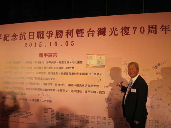 10月5日,由香港50多家民间团体联合举办的“香港各界纪念抗日战争胜利暨台湾光复70周年大会”在香港会议展览中心举行。 中共中央政治局委员、中央统战部部长、中国和平统一促进会执行副会长孙春兰,全国政协副主席董建华,香港特区行政长官梁振英,中央政府驻香港特区联络办公室主任张晓明,国务院台湾事务办公室主任张志军等出席大会,来自祖国大陆及港澳台地区的逾1000名代表参加了本次活动。