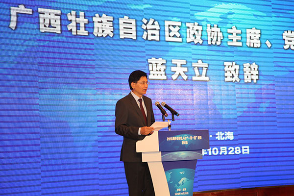 广西壮族自治区政协主席、党组书记蓝天立在开幕式上发表了讲话,重点介绍了广西自治区发挥独特区位优势、推进“一带一路”南向大通道建设的成功经验和长远规划。中共北海市委书记、市人大常委会主任王乃学发表了致辞,介绍了北海开放开发的历史及参与“一带一路”建设的相关情况。广西壮族自治区商务厅厅长蒋连生作广西投资环境推介。