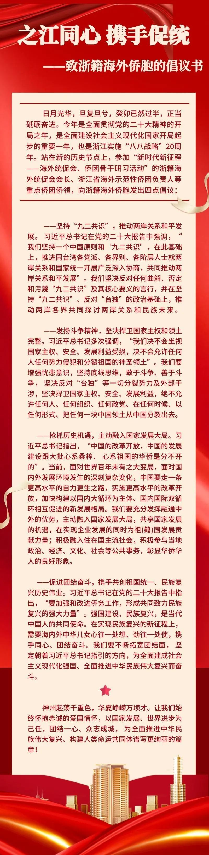 启动仪式上,全体侨领代表共同发起“之江同心 携手促统”倡议:坚持“九二共识”,推动两岸关系和平发展;发扬斗争精神,坚决捍卫国家主权和领土完整;抢抓历史机遇,主动融入国家发展大局;促进团结奋斗,携手共创祖国统一、民族复兴历史伟业。