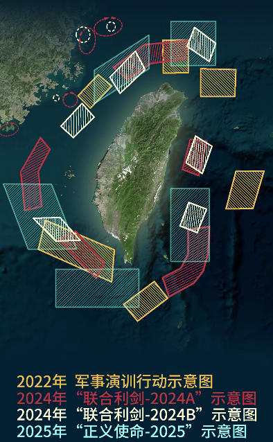 相比解放军以往进行的“联合利剑”“海峡雷霆”等演训活动,“正义使命-2025”有何不同?从目前可见的各项信息中,至少可以观察到三点变化。