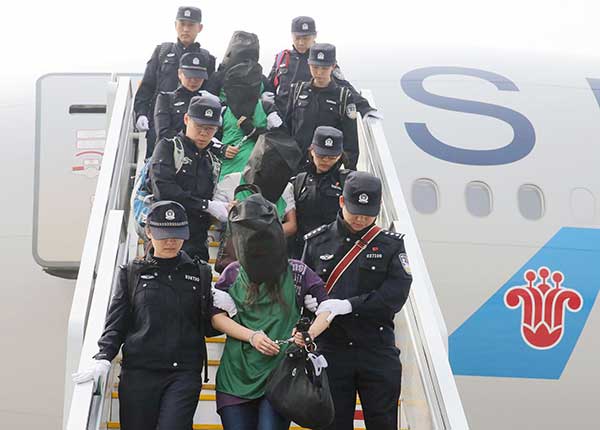 在北京首都机场,电信诈骗犯罪嫌疑人被包机押解回国