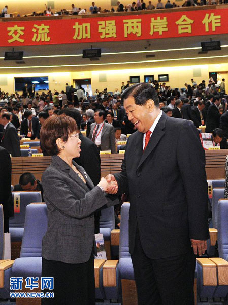 6月17日,第四届海峡论坛大会在厦门举行。中共中央政治局常委、全国政协主席贾庆林出席大会并致辞。这是贾庆林与中国国民党副主席洪秀柱握手。 新华社记者 饶爱民 摄