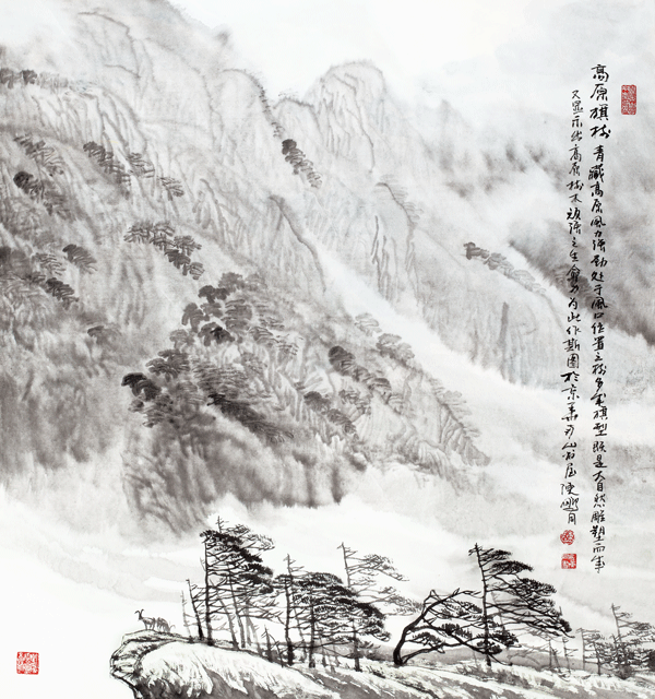 莫言是用小说讲故事的人,同为山东人的陈鹏同则是一位用画作讲故事的人。陈鹏同的作品,气势或磅礴恢宏,或安静祥和,格调厚雅,视角独特,意境灵动多变,每一幅作品仿佛都在讲述着他所看到的故事。作品《石头寨》中顺山绵延的寨子,依势而泄的河流,被石头这一生活“原料”刻画得清新古朴,再加上石道上独行寨民之人物衬托,更显作品之安静和祥。再观作品《高原旗树》,以风口处挺拔之树木为画眼,生动描述了树木在长年疾风的打造下,有如一面旗帜矗立在风口的坚毅形象,再以宏厚的大山用缭绕飘逸的画风为背景,更加衬托出“旗树”的顽强。静观方能感其气势,有如刚烈之风掠过面前一般。陈鹏同的作品摆脱了青山绿水和云雾新阳等传统元素的束缚,更加注重人文情怀的展现,画作的意义更加丰富、新颖。作品《松格玛尼城》线条虚实结合优美,构图宏大,冲击力强,运用朝拜人物与城、山的对比,将信徒对藏传佛教的虔诚表现得淋漓尽致。