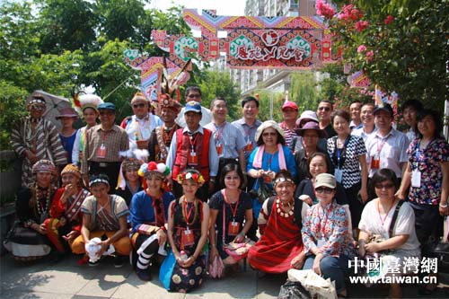 台湾少数民族参访团在恩施女儿会游园相亲活动上合影(中国台湾网 雍紫薇 摄)