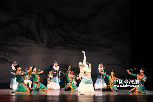 4月10日,新疆和田新玉歌舞团在嘉义表演艺术中心表演歌舞玉田女。(中国台湾网 高斯斯 摄)