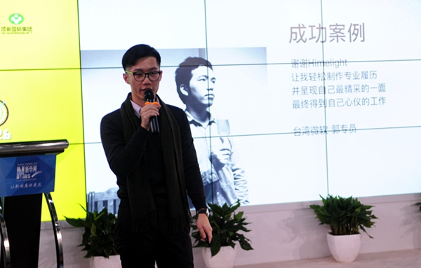“大家好!我是郑依明,我是90后!今天第一次来北京,非常兴奋!”首期台港澳青年创客分享会上,台湾创业团队Himelight主创郑依明用这样热情洋溢的开场白,开始了他的分享。他所分享的项目Himelight,正利用专业简历制作、人际关系引荐和分享等功能,试图打造一个连结年轻求职者和创业团队、企业主之间的商业社交平台。