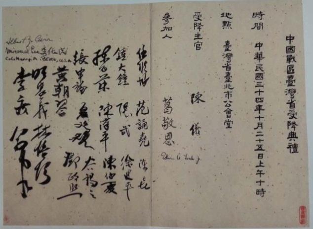 从1945年8月15日日本天皇宣布无条件投降至“中国战区台湾省受降典礼”(图二:受降典礼签名薄)举行的10月25日,其间的70天常被称为“空白期”。实际上,从1945年9月1日起,已有中国官方和军方人员到达台湾并开始工作。当年的《大公报》记者李纯青在《台北散记》里说:“第一批去台湾的有三个人,福建省顾问黄澄渊,中美合作所黄昭明,三民主义青年团张士德,他们9月1日到达台北,次为中国空军,再次乃是前进指挥所”。