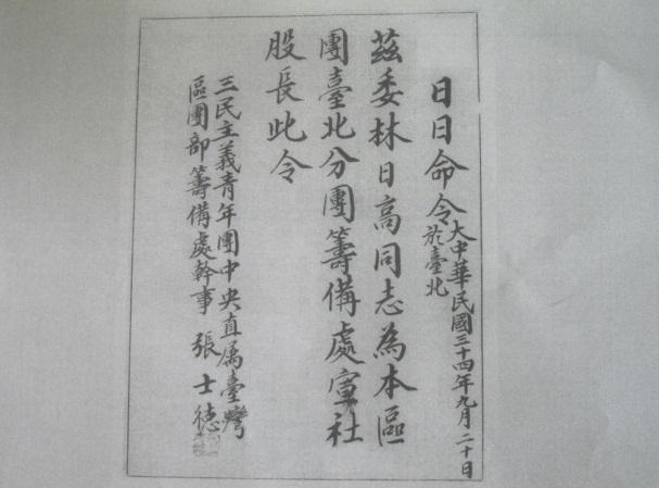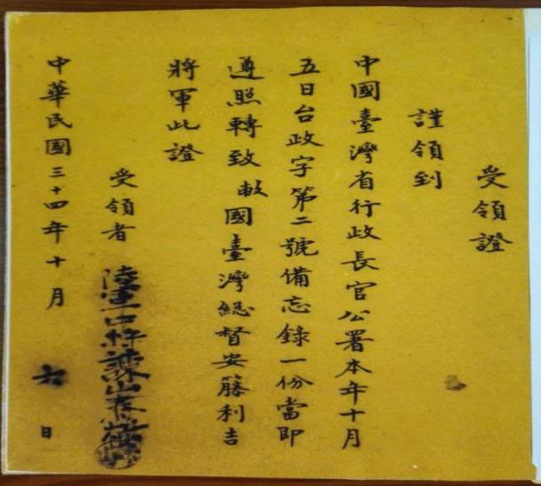 据我所知,黄澄渊曾于1937年任福建上杭县长、1938年任福建古田县长、1941年任福建仙游县长。1945年9月1日以福建省政府顾问名义随美军陆军驻闽军务处三名上尉军官到台慰问并解救拘留在台的1300余名盟军俘虏,此项工作“于10日之内完成”;黄昭明是中美合作所闽南指挥部的上校参谋;张士德是台湾义勇队上校副总队长,时以“三青团台湾区团部筹备处干事”的名义到台,并即征收团员、组建机构、任命干部,他给林日高的任命书是1945年9月20日签发的(图三)。至于“中国空军”部队,其驻地在台南,首长为“张司令”;“前进指挥所”是台湾省行政长官公署和台湾省警备司令部的先遣队,于10月4日到达台北并即办理公务,10月6日,侵台日军参谋长谏山春树受领“中国台湾省行政长官公署本(1945)年10月5日台政字第二号备忘录”(图四:《受领证》)。谏山春树后来作为战犯被判无期徒刑。另外,“美国陆军驻闽辅助空军地面军务总处主任秘书”陈镜秋等人也在9月间到了台湾。而陈孔达中将率领的“国军70军”是9月17日到达台湾的。