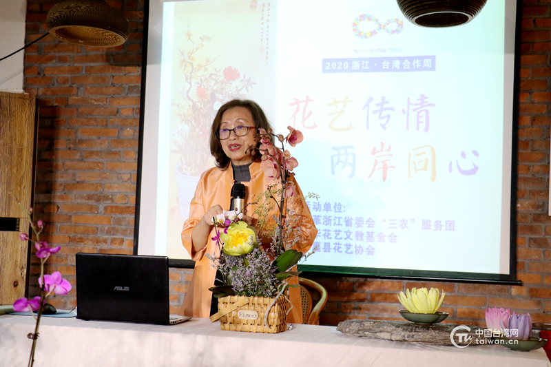 台湾中华花艺文教基金会教授林爱卿发表两岸花艺知识主旨演讲。(中国台湾网 普燕 摄)