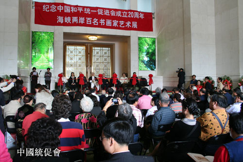 9月25日,为纪念中国和平统一促进会成立20周年,由中国和平统一促进会和台湾会馆主办的“海峡两岸百名书画家艺术展”在北京民族文化宫举行。